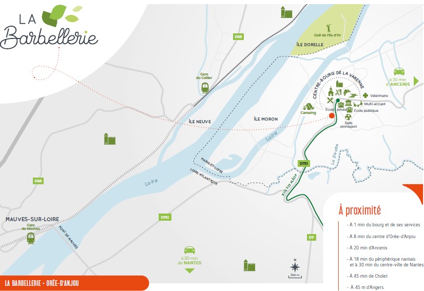La Barbellerie est implantée à 5 minutes à pied du centre-bourg de la commune déléguée de La Varenne, à quelques pas de la Loire et de l’île Moron. Le lotissement s’implante au coeur d’un quartier pavillonnaire. Il est desservi par des voies piétonnes et pistes cyclables menant au centre de la ville.