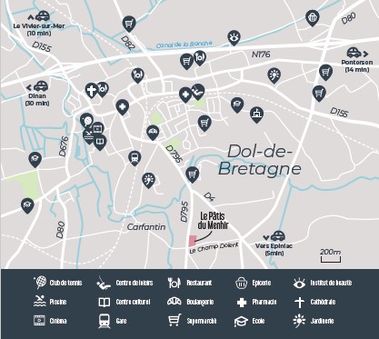 La résidence Les Pâtis du Menhir est implantée à 2 km au sud du centre-ville de Dol-de-Bretagne, près du village de Carfantin. Elle bénéficie de la proximité d’une ville de taille moyenne, de grands axes routiers et du calme d’un lotissement familial. Les commerces et services, ainsi que la gare, sont accessibles en moins de 5 minutes en voiture. Le Pâtis du Menhir offre 18 lots individuels, comprenant chacun leurs espaces verts et leurs stationnements. L’agencement du lotissement prévoit l’intégration d’aménagements paysagers communs, de places de parking complémentaires et de voies de circulation douce sécurisées.