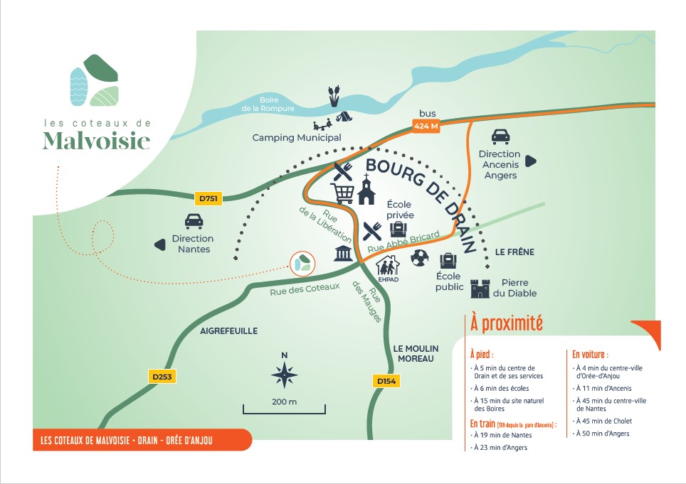 Niché dans un écrin de verdure sur le territoire de Drain, le lotissement Les Côteaux de Malvoisie profite d’une localisation privilégiée, offrant un accès aisé, à pied ou à vélo, aux commerces et services du centre-ville. Cette proximité, combinée à la beauté naturelle des Boires et ses sentiers de promenade, fait des Côteaux de Malvoisie un choix de résidence idéal pour ceux désirant vivre au plus près de la nature tout en restant connectés aux commodités essentielles.